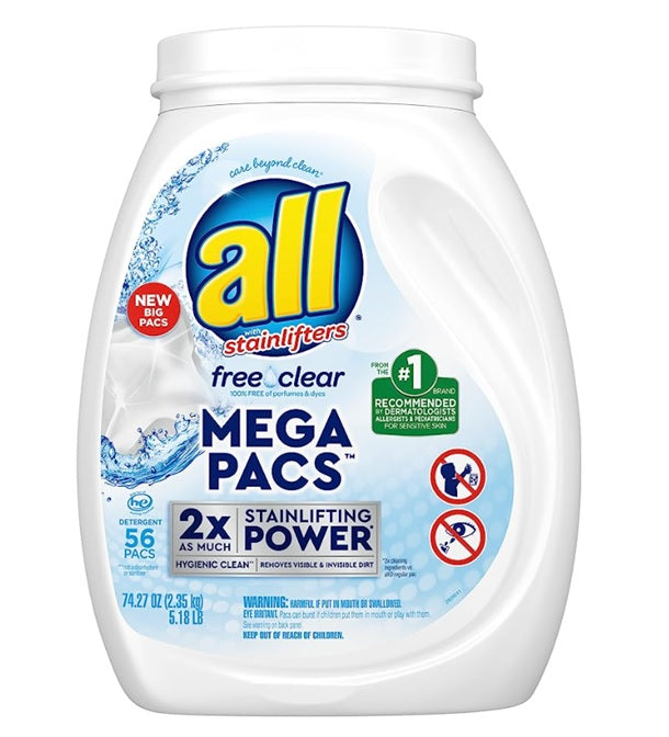 All Mega Pacs Laundry Detergent Pacs Free & Clear for Sensitive Skin - 56ct/4pk