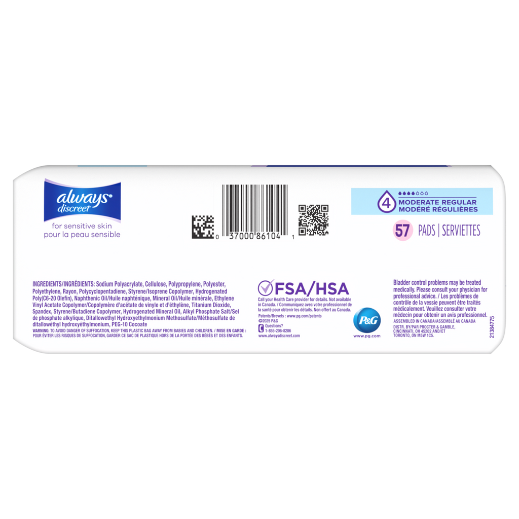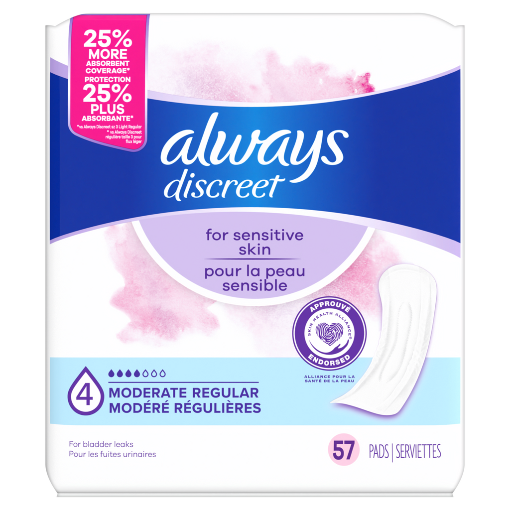 Always Discreet Incontinence Pads For Women With Bladder Leaks Sensitive Skin Pads Moderate Absorbency Regular Length - 57ct/3pk
