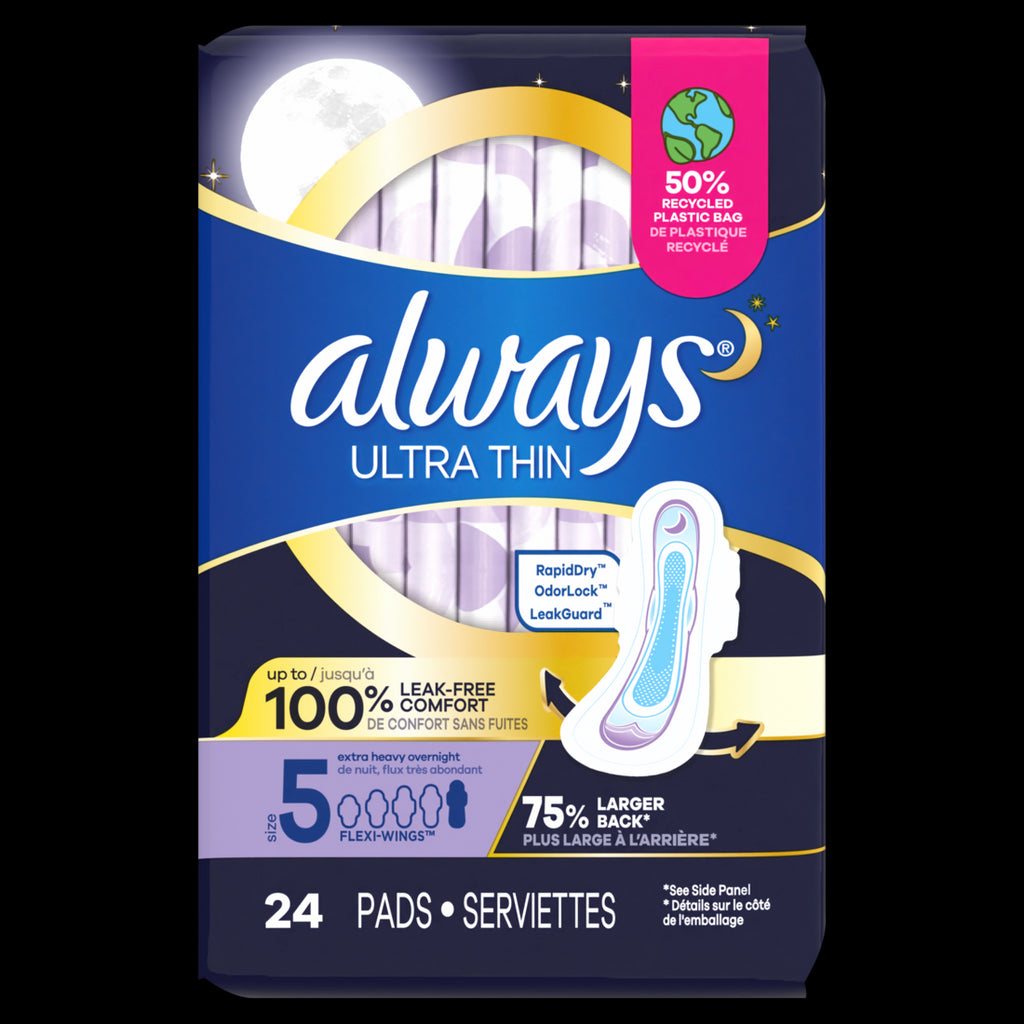 Always Ultra Thin Overnight Pads with Flexi-Wings Size 5 Extra Heavy Overnight Unscented - 24ct/3pk