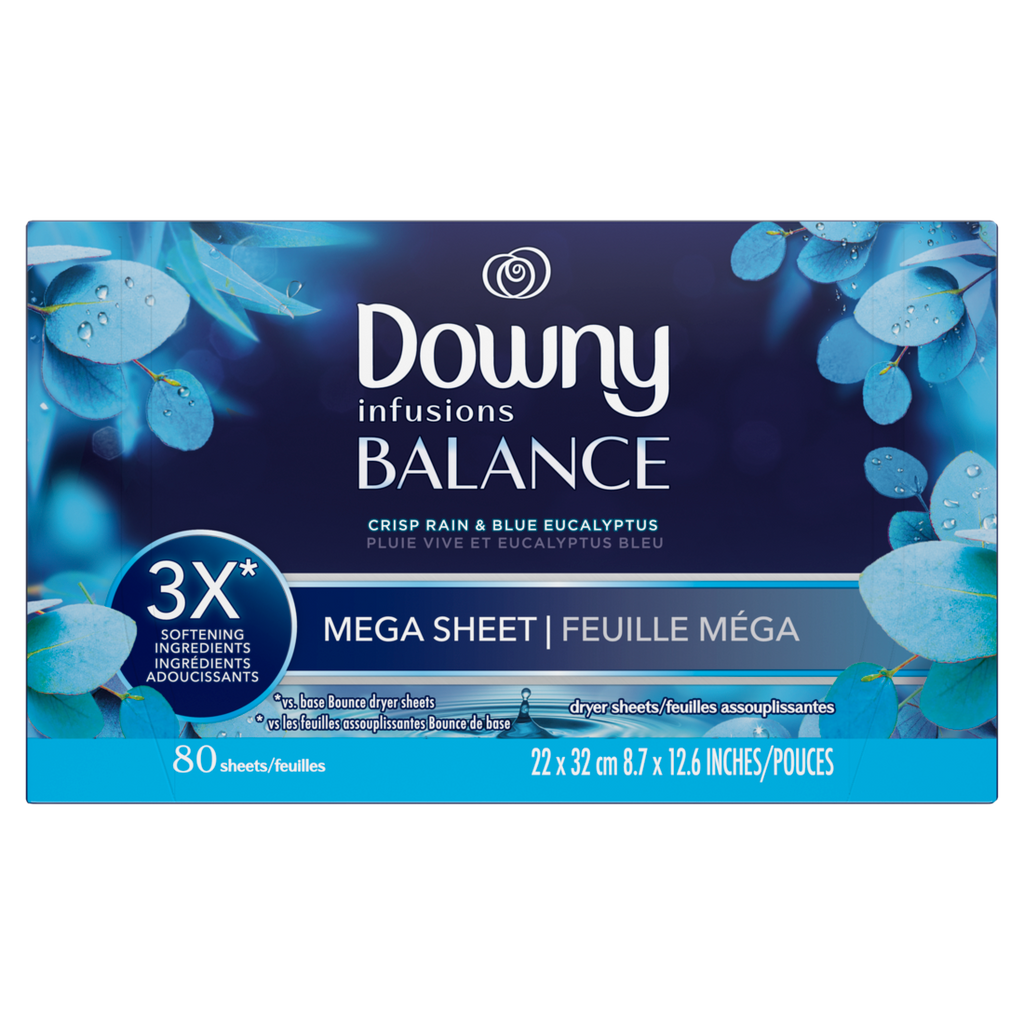 Infusions Mega Dryer Sheets Laundry Fabric Softener Balance Crisp Rain And Blue Eucalyptus - 80ct/4pk