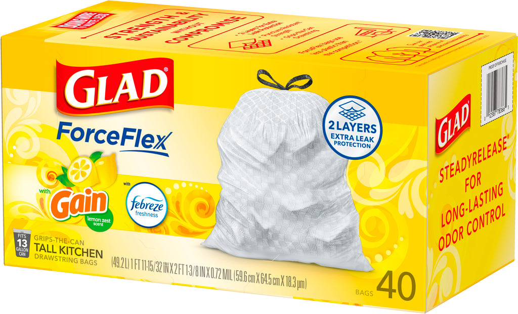 Glad ForceFlex Tall Kitchen Drawstring Trash Bags 13 Gallon White Gain Lemon Zest with Febreze Freshness - 40ct/6pk