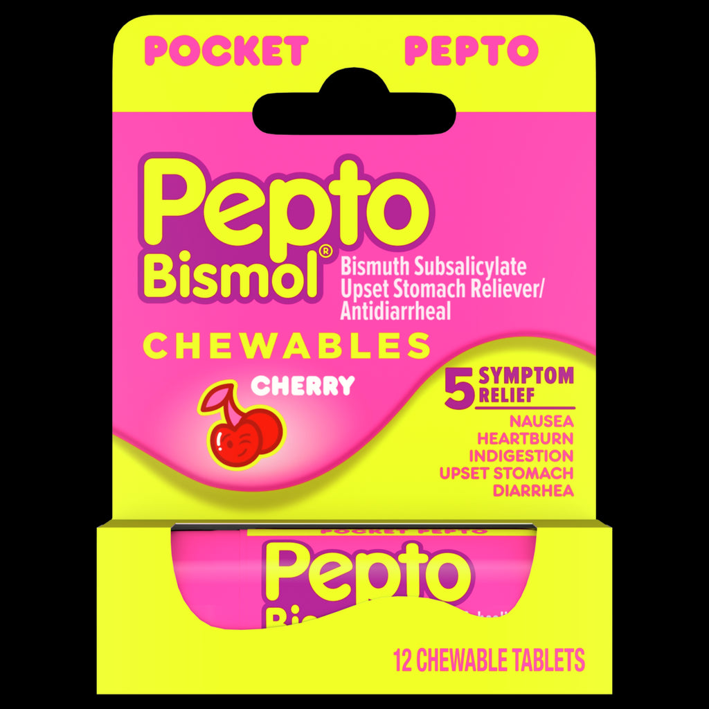 Pepto Bismol Pocket Chewable Tablets for Nausea Heartburn Indigestion Upset Stomach and Diarrhea - 5 Symptom Fast Relief Cherry Flavor - 12ct/24pk
