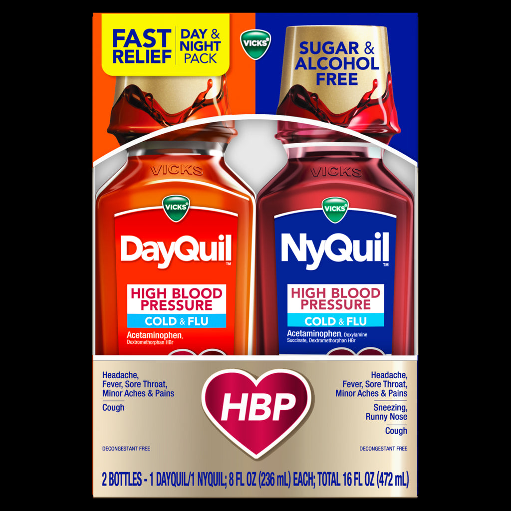 Vicks DayQuil and NyQuil High Blood Pressure Cold and Flu Relief Liquid Medicine Sugar & Alcohol Free Combo Pack - 8oz/3pk