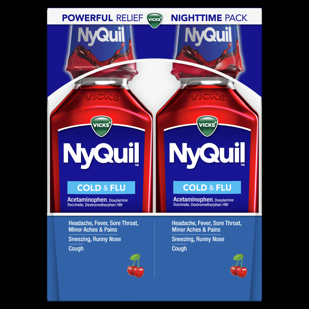 Vicks NyQuil Cold and Flu Medicine Cherry Flavor Relieves Nighttime Cough Sore Throat Fever Runny Nose Twin Pack - (2x12)oz/6pk